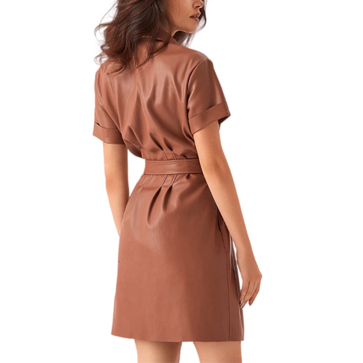 Gueuusu Gueuusu Women S Solid Color Lapel Dress Single Breasted Belt One Piece Short Sleeved Leather Clothing Walmart Com Walmart Com